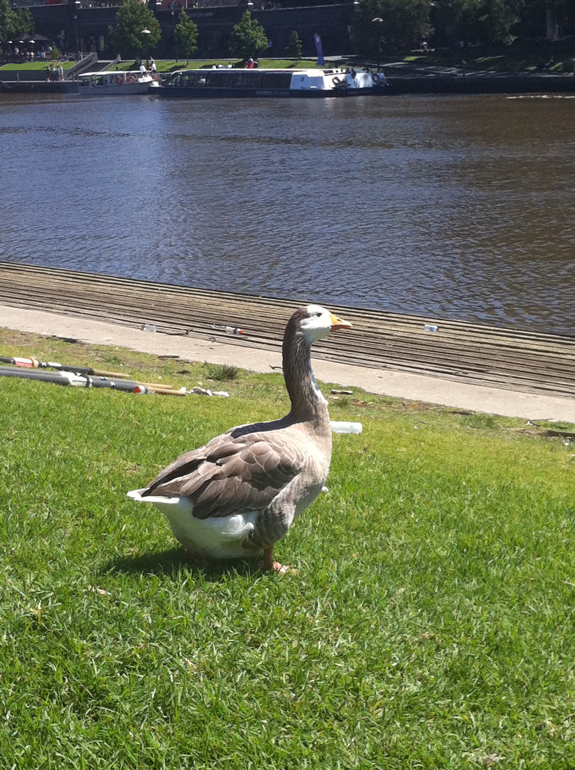 On beautiful sunny days you can see hundreds of couples, tourists and kids enjoying picnics on the banks of the Yarra, lazing with a wine in the private gardens behind the Victorian Galley or relaxing on the grass squares of Federation square and the QV. As I walk the tree-lined streets of this city I feel I am in constant connection with nature.On this particular day I lie serenely on the sloping banks between the Alexandra Gardens and the Yarra, listening to the gentle tinkling sounds of church bells and wind chimes floating across the river as I gaze above to the leafy branches dangling above like huntsman legs. To my left a large goose waddles around, honking occasionally as it wanders in between the rowers preparing their race boats.