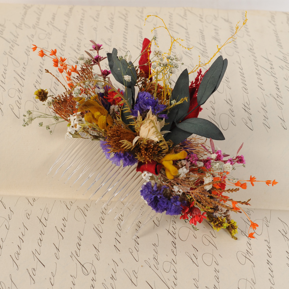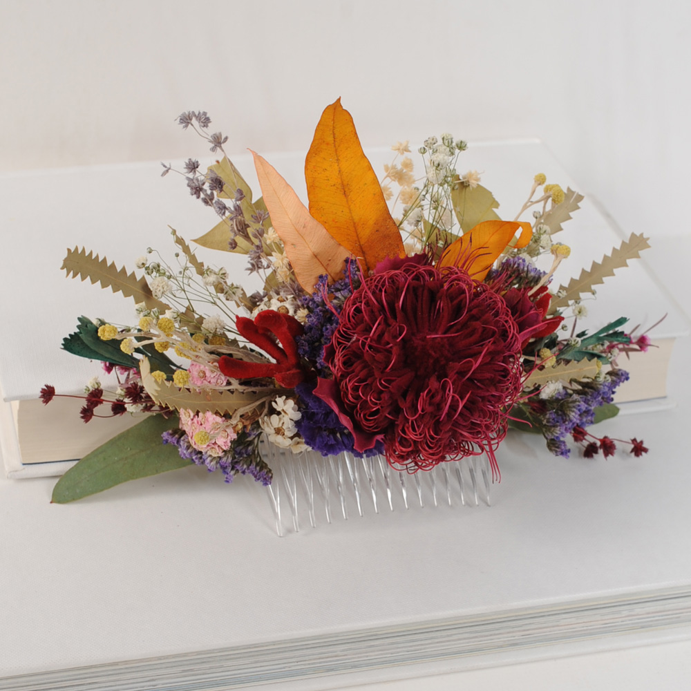 I started trawling the internet, looking for ideas on flower hair styles -whilst simultaneously developing an intense Pinterest addiction(fellow brides, don’t act like you haven’t been there hehe) when I came across an Etsy store named Velvet Tea Cup. Based a few hours from Brisbane, designer Coralie Milne creates and sells gorgeous hair accessories using a range of beautiful dried flowers from Western Australia, and a collection of tulle, rhinestones, beading and antique fabrics. I sent Coralie an email, asking if she would be able to custom design me a small flower comb to compliment my native flower bouquet.