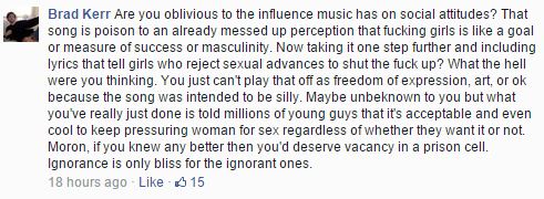 So not only are you insulting women RedFoo, but you are also insulting men if you assume that no male would have a problem with a song that includes lyrics such as ”shut the fuck up”, and “I don’t want to hear no.”