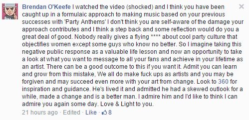 Unsurprisingly RedFoo has been upset by the media’s criticism, and yet has still failed to respond in a thoughtful way. The apology issued on his facebook completely failed to even mention the song, or the way it depicted women; instead rambling on about being an artist who wants to ‘‘unite all of us through laughter, dance & celebration.”