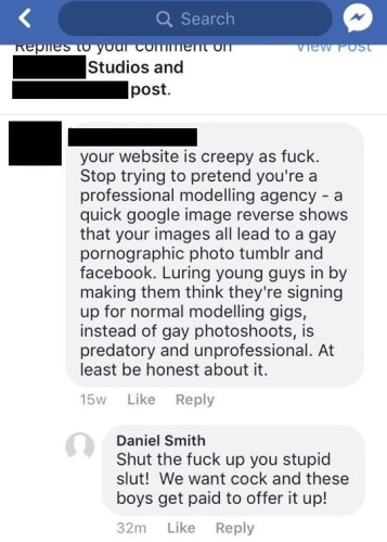When I decided to confront the ‘modelling’ studio on the fact that they were luring young men – including teen boys – into gay porn by pretending to be a photography studio, I was called a slut and told by a man named Daniel Smith to ‘shut the fuck up.’